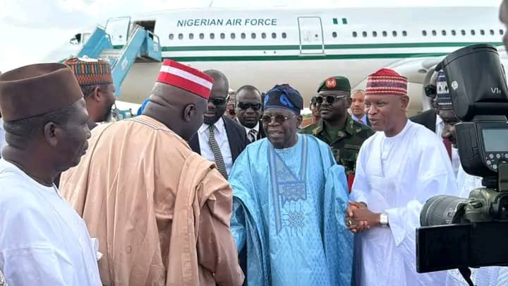 President Bola Ahmed Tinubu has landed at Aminu Kano International Airport in Kano on his mission to condole the family of billionaire businessman and philanthropist, Alhaji Aminu Dantata.